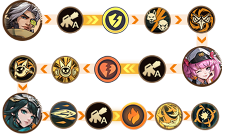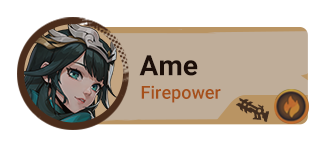 Ame sebagai hero output utama, dengan atribut IGNITE dan ledakan tinggi dari Senjata Chainblade Rifle, untuk meningkatkan frekuensi menembak, dengan pasif "Divine Wings" yang terus meningkatkan output ledakan. Di saat yang sama,  Kukik dan Lilith akan memberi Ame Crit Rate, Crit DMG, DMG Abnormal, dan bonus POWER.